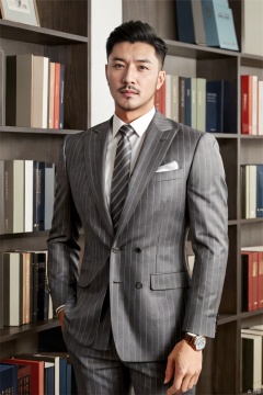 jzns,hzbz,1man,solo,asian,handsome,realistic, male focus, indoors, striped, wristwatch, pinstripe pattern, collared shirt, grey pants, white shirt, facial hair, grey striped formal,grey striped pants,grey necktie, bookshelf, blurry,(masterpiece,realistic,best quality,highly detailed),
