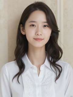 A close-up shot of a young Asian woman with long dark brown hair and brown eyes. She is wearing a white collared button down shirt with white embroidery on the collar. Her lips are a vibrant shade of pink. Her eyebrows are a light brown and her eyes are a darker shade of brown. She has a slight smile on her face. The backdrop is a light beige wall.