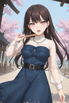 1girl, solo, long hair, breasts, looking at viewer, open mouth, bangs, brown hair, black hair, long sleeves, dress, holding, jewelry, purple eyes, earrings, belt, necklace, see-through, blue dress, hand fan, see-through sleeves,pink eyes,taki