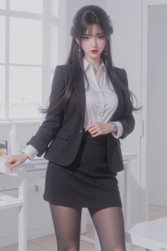 1girl, solo, long hair, breasts, looking at viewer, skirt, shirt, black hair, hair ornament, jewelry, standing, jacket, full body, white shirt, pantyhose, earrings, open clothes, collared shirt, indoors, miniskirt, black skirt, black footwear, high heels, black jacket, black pantyhose, formal, suit, pencil skirt, red lips, office lady, skirt suit