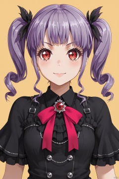 1girl, solo, looking at viewer,Udagawa Ako,bangs,red eyes,twintails,purple hair