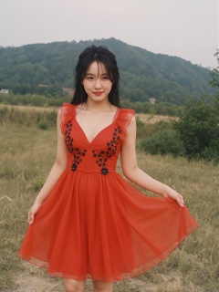 a young Asian woman stands in a vibrant red sleeveless dress adorned with black flowers. Her hair is pulled back, cascading over her shoulders, adding a touch of warmth to her face. The dress is adorned with a deep V-neckline, adorned with small black flowers adorns the dress. She is smiling, her lips pursed, and her eyes are slightly open. The backdrop, a grassy field stretches out to the left of her, with a hill covered in trees and bushes in the distance. The sky is a muted blue, dotted with a few wispy clouds.