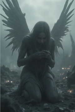 A dark, somber scene featuring a fallen angel, her once-white wings now tattered and blackened by fire. She kneels in a desolate, ash-covered wasteland, her head bowed in despair. The composition is low-angle, emphasizing her fallen stature and the vast, empty sky above. The lighting is muted and gloomy, with a cold, gray tone dominating the scene. Her expression is one of deep sorrow and regret, her hands clasped in prayer. The location is barren and lifeless, with remnants of a once-great civilization adding to the sense of loss and decay.