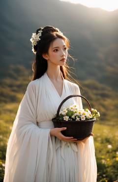 score_9,score_8_up,score_7_up,score_6_up,score_5_up,hanfu, On Mount Olympus, which is full of divinity, a Chinese girl wearing a white Hanfu gently passes by, holding a basket full of beautiful flowers in her hands. In the bright sunshine, her hair is fluttering, exuding remarkable beauty.