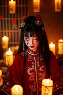 In the background, a dimly lit room is filled with a warm, golden glow from multiple candles, casting a soft, flickering light on her. The candles are arranged in a semi-circle around her, creating a sense of intimacy and mystique. The setting suggests a ritualistic or ceremonial ambiance. The overall composition is rich in texture and detail, with a gothic, surreal quality.eating a vibrant and richly textured setting. The lanterns are intricately designed, with some featuring intricate calligraphy and others with traditional Japanese motifs.
