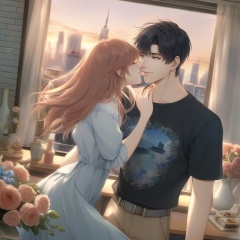 <lora:20241029-1730164497477:0.8>,The image shows a young couple in a romantic embrace. The man is on the right side of the image, wearing a black t-shirt with a blue logo on it. He has dark hair and is looking down at the woman with a slight smile on his face. The woman has long blonde hair that is styled in loose waves and is wearing a blue dress. They are standing in front of a window with a view of a city skyline in the background. The couple appears to be in a room with a brick wall and a table with a vase of flowers on it in the foreground.