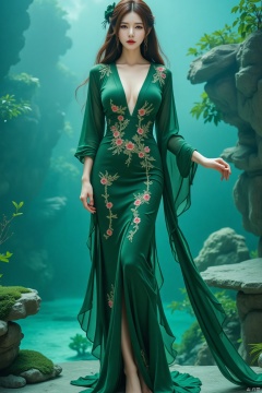 The banshee of the Emerald Sea, she wears a robe woven from emerald green water plants, embroidered with mysterious creatures of the deep sea. Her hair is like kelp floating in the waves, swaying gently in the current, as if it is light kelp in the deep sea dancing gently in the waves. Tim Burton's fantasy style shapes her into an emerald sea nymph in the deep sea.