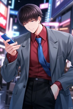 a cartoon character, dressed in a gray blazer, a red button-down shirt, a blue tie, and black pants, is holding a blue cell phone in his right hand. His left hand is resting on his hip. The character's eyes are closed, as if he is looking down at the phone. The background is blurred, suggesting a cityscape. The scene is lit up with a few lights, adding a pop of color to the scene.