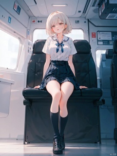 a woman is seated on an airplane seat. She is dressed in a short-sleeved white blouse, a black skirt, and black stockings. Her hair is styled in a sleek bob, and her lips are painted a bold red. The seat she is sitting on is a light beige, and the seat she's sitting on has a black belt tied around her waist, adding a pop of color to the scene. The floor beneath her is a grayish-blue carpet. To the right of her, another seat is visible, and a black container with a yellow label on it is visible.