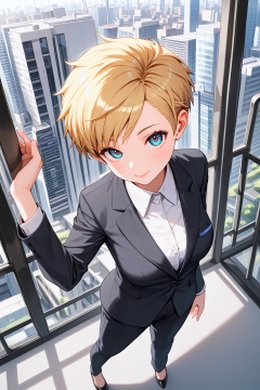 score_9,  best quality,dynamic,from above,1girl,city,blonde hair,pixie hair,looking at viewer,business suit