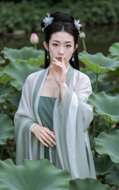 masterpiece,(best quality),official art, (1girl), (solo), ((looking_at_viewer)),(huge breasts:2.69),(full breasts:1.99),Xzhaoliner,(Lotus pond, lotus:1.52),Xruanxiu,Xfhanfu,Xqhanfu,Xqinghanfu,Xqipao,Xyueying
