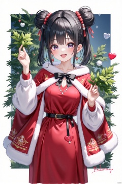 masterpiece,a girl with black hair in a red dress and a red capelet, wearing earrings and a black ribbon, styled with double buns and aegyo sal, showcasing a bright smile and a grin, standing in front of a Christmas tree with a white border, adorned with hearts and jewelry, featuring Korean text and a fur-trimmed capelet, exuding a festive and joyful vibe