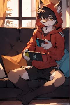 solo, looking at viewer, short hair, black hair, 1boy, holding, brown eyes, sitting, closed mouth, full body, male focus, shorts, barefoot, indoors, hood, feet, pillow, window, hoodie, toes, black shorts, curtains, couch, handheld game console, playing games, nintendo switch, game console, red hoodie, holding handheld game console,Noyu,Akira,body fur,anthro