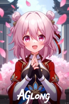 A striking movie poster featuring a solo girl with short pink hair, smiling with bangs and a hair ornament. She wears long sleeves, fingerless gloves, and Chinese clothes, her pink eyes radiant. Pink petals float around her, creating a magical ambiance. The scene is framed with soft lighting, capturing her vibrant expression. At the bottom, the text “AGlong” is prominently displayed.