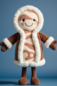 plush style,solo,looking at viewer,personification,plush tenderloin,jellycat style,smile,simple background,closed mouth,standing,full body,boots,hood,black eyes,coat,fur trim,no humans,blue background,brown footwear,outstretched arms,hood up,mittens,fur-trimmed hood,the whole presents a cute and lovely style,solid dark background,<lora:models/4416/0288affc.safetensors:0.8:0.8>