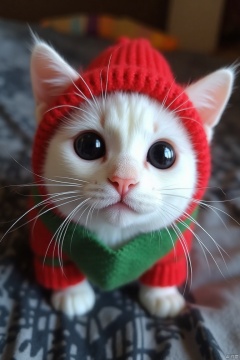 A close-up view of a white cat with black eyes, a pink nose, and white whiskers. The cat's eyes are tinted black, and the cat's head is adorned with a red and green knitted hat. The background is blurred, with a black and white patterned blanket in the background.