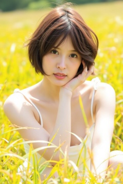 a young Asian woman is seated in a field of tall, yellow grass. She is dressed in a white bikini, her hair cascades over her shoulders. Her eyes are a piercing blue, her mouth is slightly open, revealing a pink lip. Her hands are delicate, her fingernails are adorned with white socks. The grass she is sitting on is a vibrant shade of yellow, adding a pop of color to the scene.