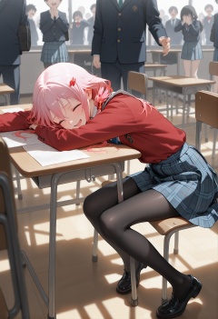 masterpiece,best quality,amazing quality,very aesthetic,absurdres,newest,Yuzuriha Inori,1girl,classroom,lying on the table,head tilted,school uniform,plaid skirt,black_pantyhose,sit on a chair,face on the table,eyes closed,saliva flowing on the table,crowds,laughing,