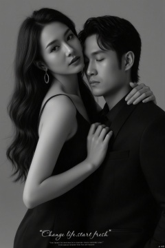 plcp,1man and 1woman,couple,realistic,hetero, This is a black - and - white fashion photography image with two figures, a man and a woman., The woman is wearing a black strapless evening gown. The design of the gown is simple, revealing her shoulders and part of her back, looking elegant and sexy. Her long hair falls naturally, and she is wearing a pair of round earrings, adding a touch of delicacy. One of her hands gently rests on the man's shoulder, with an intimate and natural posture., The man is wearing a black suit with a black shirt inside, and his overall look is simple and formal. His posture appears steady, with his head slightly lowered, corresponding to the woman's posture, creating a harmonious atmosphere., The background of the picture is a simple gray gradient, highlighting the main subjects. Below the picture, there is a text: “Change life.start fresh”, and some smaller English words,jzns