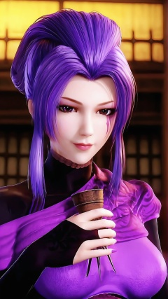 The image is a close-up portrait of a young woman with long, purple hair styled in a high ponytail. She is wearing a purple and black outfit with a high neckline and long sleeves. The outfit appears to be made of a shiny fabric with intricate patterns and designs. The woman is holding a small black object in her hand, which is likely a weapon or a weapon of some kind. She has a serious expression on her face and is looking directly at the camera. The background is blurred, but it seems to be an indoor setting with a wooden structure and string lights. The overall mood of the image is intense and dramatic.,<lora:pony紫女:0.8>,
