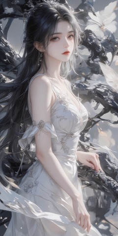 Digital art,a woman in a white dress standing in front of a black and white painting. Her face is clearly visible,with her eyes looking off into the distance. Her hair is long and wavy,and her dress is flowing around her. The painting is intricate and detailed,with a variety of shapes and colors.,