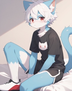 solo,male_focus,furry, (white_hair,red_eyes),(blue fur,cat_ears), body_fur,white_fur,t-shirt,shorts, BREAK, portrait,sitting,on_side, (masterpiece, best quality:1.1),body fur,anthro