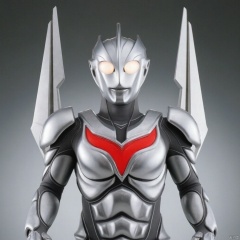ultraman noa,ultraman,silver bodysuit,silver gloves,legwear,gloves,boots,cover,mask,plugsuit,armor,bodysuit,black pattern on body,grey pattern on body,silver tight-fitting,silver footwear,helmet,leather suit,latex,tokusatsu,no humans,science fiction,silver head,hard mask,no smile,no eyes,no nose,solo,silver rubber bodysuit with grey line and black line,silver wings
