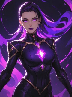 looking_at_viewer,real,ray tracing,ultra sharp,ultra high resolution,(masterpiece),(best quality),super detailed,extremely delicate and beautiful,exquisite facial features,super delicate face,cinematic light,detailed environment,ultra realistic details,facing camera,finely detailed features,cinematic lighting effects,photoreal,32k uhd,cinematic lighting effects,1girl,Reyna,purple hair,purple eyes,earrings,jewelry,looking at viewer,glowing,hair slicked back,breasts,glowing hand,glowing eyes,multicolored hair,hoop earrings,long hair,magic,purple lips,solo,bodysuit,makeup,this is a vibrant digital illustration featuring a confident,androgynous character with long,dark hair and striking purple eyes. they are dressed in a form-fitting black outfit with a high collar and a glowing purple gem at the chest. the character extends a hand forward,with a bright,ethereal purple light emanating from their palm. the background is a mix of deep blues and purples,with swirling,abstract shapes and a large,glowing eye-like symbol. the image has a dynamic,otherworldly feel.,
