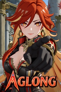 A solo shot of a girl with very long, multicolored hair (red, orange, and blonde), looking directly at the viewer with a smile. She has bangs, red eyes, and hair between her eyes. Wearing small breasts visible, black gloves, earrings, jewelry, armor with shoulder pauldrons. Her upper body is in focus, reaching towards the viewer. The setting includes a pillar, throne, and column, with a detailed background matching the movie poster theme. Three-dimensional text AGlong is in the middle below. Cinematic lighting creates high contrast and a dramatic atmosphere, with sharp focus enhancing the dynamic composition.