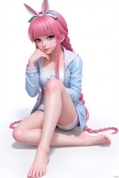 Masterpiece, best quality, high quality, (colorful), small chest, (pink hair: 1.4), (long legs: 1.3),1girl, bandaid, bandaid_on_face, bandaid_on_knee, bandaid_on_leg, bangs, blue_eyes, blunt_bangs, blush, bow, braid, bunny_hair_ornament, closed_mouth, collarbone, crossed_bandaids, hair_ornament, hand_on_own_cheek, hands_on_own_cheeks, hands_on_own_face, jacket, long_hair, long_sleeves, looking_at_viewer, short_shorts, shorts, sitting, solo, twin_braids, very_long_hair, white_background