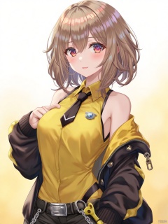 A female anime character with short brown hair, styled with a slight wave and some strands framing her face. She has large, expressive eyes with a reddish hue and a subtle blush on her cheeks. She wears a sleeveless, glossy yellow top with a black collar and a black tie. A small, silver badge or emblem is pinned to her left chest. Over the yellow top, she wears a black, glossy jacket with yellow accents on the shoulders and sleeves. The jacket is open, revealing the yellow top underneath. She also wears a black belt with a silver buckle and a chain accessory hanging from it. The background is a simple, light gradient, likely off-white or pale yellow, which helps to highlight the character and her outfit. The overall style is sleek and modern, with a focus on the contrasting colors and the shiny textures of the clothing,torino