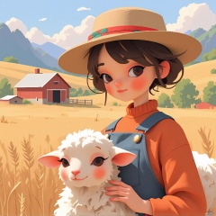 A digital page from a children's book about farm life. A little farmer girl pets a fluffy sheep, both surrounded by a barn and fields of golden wheat. The sheep's eyes are soft and content, positioned near the bottom of the frame. The background fades into a distant landscape of rolling hills, emphasizing the simplicity of farm life. The aesthetic is rustic, with earthy tones and charming details. It fuses digital illustration with a farm-themed setting.,guanghui,color trace,,vector style