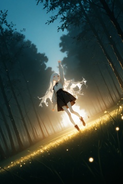 masterpiece,best quality,amazing quality,very aesthetic,absurdres,newest,extreme aesthetic,in the style of fashion photography,light particles,cinematic lighting,Visual impact,sharp focus,Emotionalization,depth of field,dutch angle,scenery,(dino_(dinoartforame):0.5),(yoneyama mai:0.5),(Yomu:0.3),happy to jump up,1girl,solo,white_hair,very long hair,scenery,single scene focus,in a meadow,grove,clouble,