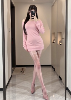 Realistic photos, 1girl, long hair, fair skin, big breast, off-shoulder pink sweater, shiny pantyhose, long legs, high heels, full body, standing in the elevator, selfie,