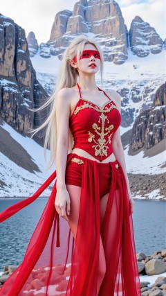 The image shows a young woman standing in front of a beautiful mountain landscape. She is wearing a red bodysuit with gold accents and a long red skirt that is flowing in the wind. The woman has long blonde hair that is styled in loose waves and is wearing red sunglasses. The mountains in the background are covered in snow and ice, and there is a body of water in the foreground. The sky is blue and there are a few clouds scattered across it. The overall mood of the image is peaceful and serene.