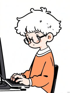 JYXT, Cartoon drawing of a young boy with short, curly white hair and glasses, wearing a long-sleeved orange shirt. He is sitting at a desk with a computer monitor and keyboard, typing away. The background is plain white, with no additional objects or scenery. The boy has a focused expression and his cheeks are slightly flushed, suggesting concentration or excitement. The drawing style is simple and clean, with thick black outlines and minimal shading.
