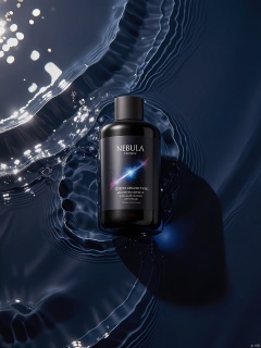 SZCJ,A flask of NEBULA night cream floats serenely on a liquid canvas,its dark glass body absorbing and reflecting light. The label,with its cosmic design and bilingual text (English and Russian),hints at the product's rejuvenating powers. The water beneath mimics the night sky's depth.,