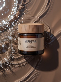 SZCJ,A jar of VERDEVIA natural moisturizer rests on waters that seem alive with movement,its earthy tones blending seamlessly with the environment. The wooden lid and rustic label,featuring text in English and Polish,evoke a sense of simplicity and purity. The water's realistic reflections play off the jar's organic shape.,
