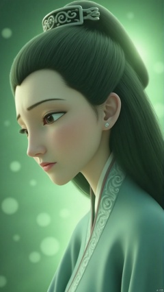 nzyfr,In a stunning illustration, a majestic and ethereal Chinese-style giantess with the delicate features of a beautiful maiden is depicted in profile. Her eyes are closed, exuding a serene and tranquil aura. The overall color palette is a soft, traditional Chinese green, evoking a sense of calm and elegance