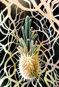 A captivating abstract scene unfolds in a digital artwork, presenting a collection of stylized cacti and desert flora against a stark black backdrop. The flora and cacti are rendered in shades of sandy beige and white, giving them a ghostly, ethereal quality.The central focus is a stylized white cactus, adorned with intricate beige markings that resemble splattered paint or watercolor effects. Its body is outlined with a delicate, almost translucent beige, and it sports a single visible black thorn resembling an eye. Attached to the cactus are thin, wispy beige spines, suggesting branches or tendrils that seem to float in the dark space.Surrounding the cactus are several abstract desert plant forms, each unique in shape and style. Some are depicted as simple, rounded forms with beige interiors, while others are more elaborate, showcasing flowing, translucent beige shapes that evoke the graceful swaying of desert grasses in the wind. One plant form in the upper right corner is particularly detailed, resembling an abstract succulent with flowing leaves and a more defined stem shape.The overall effect is reminiscent of a desert oasis at night, illuminated by a ghostly moonlight. The black background enhances the glowing quality of the beige and white figures, creating a dreamlike and visually striking composition. The artistic style suggests a digital painting or watercolor effect, emphasizing fluidity and organic forms. ,overexposure,contour deepening,lens flare,depth of field, (very vibrant colors:0.8), very high contrast, sketch, vivid colors, (saturated:1.0), colorful, very high colorfulness, deep black hues, submerged, pressure, cold atmosphere, dark atmosphere, rella, konya karasue, scratch art, color tracing