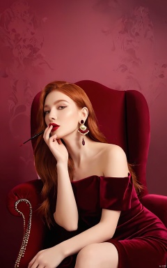 SCCP, Snapshot of a woman with long auburn hair, adorned in a velvet, burgundy dress and feather earrings, clutching a lipstick, seated on a velvet chair against a crimson background.