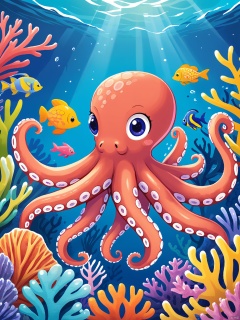 ETHB,Child insertion, A digital illustration for a children's picture book about the ocean. A curious little octopus peers out from behind a coral reef, its tentacles adorned with vibrant patterns. The ocean floor serves as the backdrop, with colorful fish swimming in a soft blur. The octopus's eyes are wide with wonder, positioned near the top of the frame. The aesthetic is mesmerizing, with contrasting colors that pop against the deep blue sea. It combines digital artistry with a playful, underwater theme.