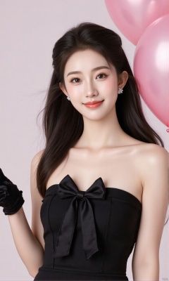 Realistic photo, 1girl, solo, long hair, looking at viewer, smile, simple background, black hair, gloves, dress, bow, bare shoulders, jewelry, collarbone, earrings, black gloves, artist name, black eyes, black dress, lips, strapless, strapless dress, realistic, balloon, heart balloon