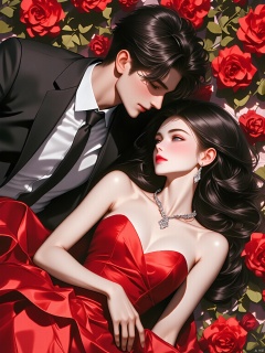 BDZC, Anime-style illustration of a man and a woman lying on a bed of red roses. The man is wearing a black suit with a white shirt and black tie, and has short, dark hair. The woman has long, dark hair and is wearing a strapless, red dress with a sweetheart neckline. She has a delicate, fair complexion and is adorned with a silver necklace and earrings. The background features lush red roses, creating a romantic and vibrant atmosphere. The style is detailed and realistic, with soft lighting and shadows enhancing the mood.