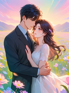 BDZC, A digital painting of a romantic couple in a field of flowers. The man, with messy dark hair and a black suit, gently holds the woman's face with one hand. The woman, with long wavy dark hair and a white dress, looks up at him with a serene expression. Soft, pastel colors fill the background, with a dreamy, ethereal quality. The artwork has a soft, painterly style, with delicate brush strokes and a gentle, glowing light. The couple is the main focus, with a blurred, picturesque background.