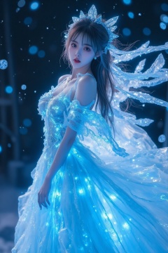 tyz,"A goddess of ice with translucent diamond skin glowing with internal frost veins, wearing a holographic snowstorm dress where:Skirt light effect: Cascading chiffon layers refract prismatic auroras into fractal ice caustics (Unreal Engine 5 Lumen real-time global illumination)Quantum snow dust: Anti-gravity snowflakes orbiting her body emit bioluminescent pulses (wavelength 480nm blue cold light)Dynamic interaction: Every footstep freezes air moisture into suspended ice sculptures with SSS subsurface scatteringPhoton battle armor: Breath vapor crystallizes into photon armor plates (material: Principled BSDF Clearcoat 0.9 + Transmission 0.96)Aurora fluid: Volumetric neon ribbons bend around her silhouette (Houdini fluid simulation + 8K Octane volume fog)"