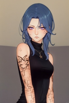 QH,It was a heavily inked illustration of a young woman with long,straight,dark blue hair and piercing purple eyes. She wore a sleeveless grey-and-black turtleneck top,and her expression was serious and determined. The background is gently blurred with gradients of warm and cool tones,suggesting a dynamic,possibly magical environment. The overall style is full of energy and detail,which is typical of modern Japanese anime art.,