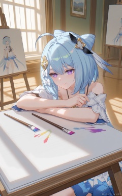 8k,best quality,masterpiece,(ultra-detailed),(high detailed skin),((artist:reoen),(artist:fuzichoco),(artist:atdan),(artist:torino_aqua),year 2024:0.8),[artist:wlop],[artist:ningen_mame],artist:ciloranko,[[artist:rhasta]],artist:tidsean,colorful,<lora:xl-ill-Griseo(Honkai Impact 3)-v1-000010:0.8>,easel,canvas \(object\),still life,griseo:xiamengruhui\(honkai impact 3\),1girl,solo,long hair,hair ornament,ahoge,blue hair,hair between eyes,purple eyes,smile,paintbrush,