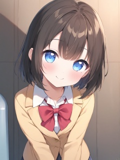 loli,cute,1girl, solo, looking at viewer, smile, short hair, bangs, blue eyes, skirt, shirt, long sleeves, ribbon, school uniform, jacket, white shirt,