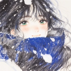 blue garment that appears to be a coat or a scarf. The snowflakes are depicted in white